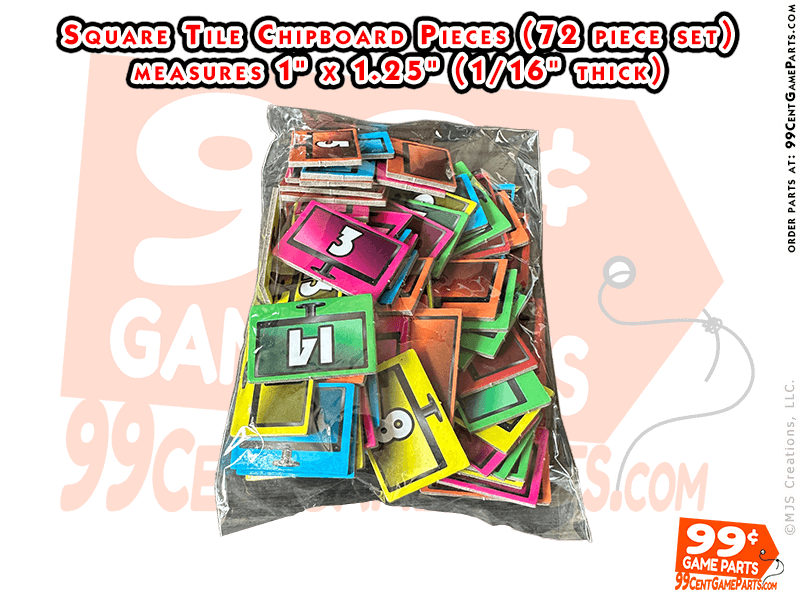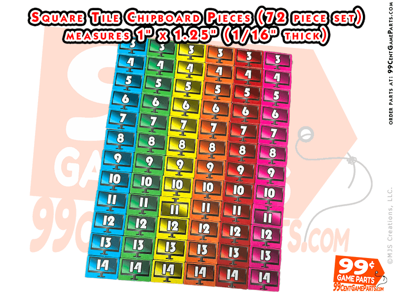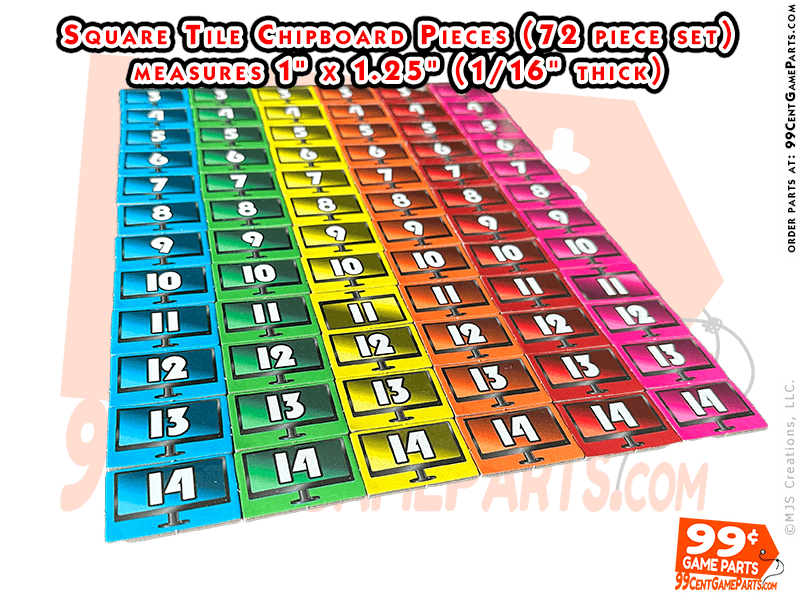 12 of each color numbered 3-14 in 6 different colors. Each Measures 1.5″ x 1″ (approx. 1/16” thick chipboard). Use as is, Print your artwork from your own printer, then cut and mount them onto each piece to make your own custom full color printed game pieces!